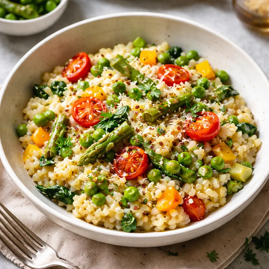 Added at the end of cooking — green, sweet peas for a contrast of color and texture. If using fresh, briefly blanch them.
