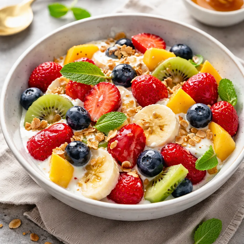 Use thick Greek yogurt without added sugar. Its creamy texture and slightly tangy flavor perfectly balance the sweetness of the fruits. It is rich in protein and probiotics, which support gut health. For a vegan version, you can use thick coconut yogurt.