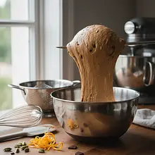 Start by preparing the yeast mixture. In a small saucepan, heat the milk until it is slightly warm but not hot (about 37°C – the ideal temperature is one that you can barely feel on your wrist). In a large bowl, crumble the fresh yeast, add one tablespoon of sugar (from the measured portion of 70g), and pour in the warm milk. Gently mix with a fork until the yeast dissolves. Cover the bowl with a clean cloth and set it in a warm, draft-free place for about 10-15 minutes. After this time, a thick, bubbly foam should appear on the surface, indicating that the yeast is active.