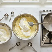Add the whipped cream to the cheese mixture with gelatin. Do this in two or three batches. Use a large silicone spatula and very gently fold the cream into the cheese mixture with an upward motion. The goal is to combine the ingredients while retaining as much air from the whipped cream as possible.