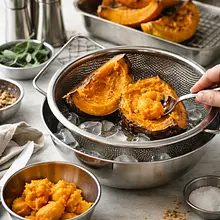 Preheat the oven to 200°C (fan). Wash the Hokkaido pumpkin, cut it in half, and use a spoon to remove the seeds and fibrous flesh. Cut the pumpkin into smaller pieces (about 4-5 cm) and place them on a baking sheet lined with parchment paper. Bake for about 30-40 minutes, until the flesh is very soft (check with a fork). At the same time, wash the potatoes thoroughly and boil them in their skins in salted water until soft (about 20-30 minutes).