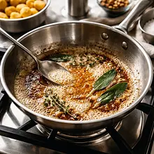 Heat the butter until it starts to foam, then brown and release a nutty aroma (this is called 'beurre noisette'). Be careful not to burn it – the process takes 3-4 minutes. When the butter turns amber, add the sage leaves to the pan. Fry them for about 1 minute until they become crispy and aromatic. Reduce the heat to the minimum.