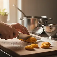 Cut the roll into small pieces about 2 cm long using a knife or scraper. Now it's time to give them their characteristic shape. Gently roll each piece over the tines of a fork, lightly pressing with your thumb. Alternatively, you can use a special wooden gnocchi board. The grooves will help the sauce cling better to the dumplings. Place the formed gnocchi on a tray or board generously sprinkled with flour, making sure they do not touch each other.
