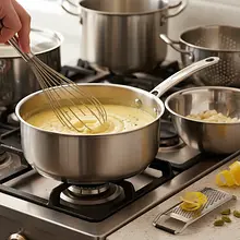 Heat the mixture on low power, stirring constantly with a whisk. Stir slowly but continuously, paying special attention to the bottom and edges of the bowl, where the mixture thickens the fastest. The cooking process will take about 10-12 minutes. The curd is ready when it thickens noticeably and has the consistency of a thin pudding. The best test is the spoon test: dip a wooden spoon into the cream, remove it, and run your finger along the back. If a clean path remains that does not run together, the curd is ready.
