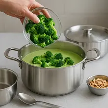 After 10 minutes of cooking, add the broccoli florets to the pot. Cover again and cook for another 5-7 minutes. The goal is for the florets to become tender while still retaining their vibrant green color. If you cook them for too long, the soup will lose its beautiful color and turn grayish-green.