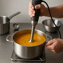 Remove the pot from the heat. Using an immersion blender, blend the soup until it is perfectly smooth and velvety. To avoid splattering hot soup, make sure the blender's tip is fully submerged in the liquid before turning it on. Blend, moving the blender up and down and side to side to reach all the vegetables. This process should take about 2-3 minutes. The soup should have a uniform, smooth consistency without any lumps.
