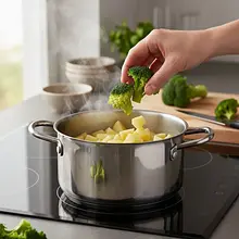 Do garnka z podgotowanymi ziemniakami dodaj różyczki brokułu. Ponownie przykryj garnek i gotuj przez kolejne 5-7 minut. Brokuły powinny stać się miękkie, ale zachować swój intensywnie zielony kolor. Nie gotuj ich zbyt długo, ponieważ staną się szarozielone i stracą smak oraz cenne witaminy. Aby sprawdzić, czy są gotowe, nakłuj jedną z różyczek widelcem - powinien wejść bez problemu.