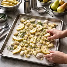 In a large bowl, place the chopped parsnip, pears, onion, and whole garlic cloves. Melt the butter in a small saucepan or in the microwave. Drizzle the melted butter and one tablespoon of olive oil over the vegetables. Season generously with salt and freshly ground pepper. Mix everything thoroughly with your hands or a large spoon, ensuring each piece of vegetable is coated with fat and spices.