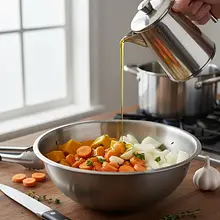 Peel the carrots using a vegetable peeler, trim the ends, and cut into thick slices (about 1-2 cm). Peel the onion and cut it into wedges. Peel the garlic, but leave the cloves whole.