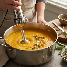 Remove the pot from the heat. Using an immersion blender, blend the soup directly in the pot until it is perfectly smooth and velvety. Move the blender up and down and side to side to ensure there are no lumps. Blending may take 2-3 minutes.