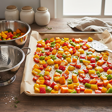 Wstaw blachę do nagrzanego piekarnika i piecz przez około 35-40 minut. Warzywa są gotowe, gdy dynia jest całkowicie miękka (można to sprawdzić, nakłuwając ją widelcem – powinien wchodzić bez oporu), a brzegi warzyw są lekko przypieczone i skarmelizowane.