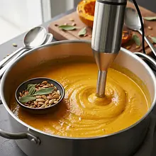 Zdejmij garnek z ognia. Używając blendera ręcznego (żyrafy), miksuj zupę bezpośrednio w garnku, aż do uzyskania idealnie gładkiej, aksamitnej konsystencji. Poruszaj blenderem w górę i w dół oraz po całym garnku, aby upewnić się, że nie ma żadnych grudek. Miksowanie może potrwać 2-3 minuty.
