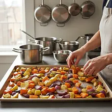 Spread the seasoned vegetables in an even, single layer on the prepared baking sheet. Place in the preheated oven and bake for about 35-45 minutes. Halfway through baking (after about 20 minutes), stir the vegetables with a spatula to ensure they brown evenly. The vegetables are ready when the pumpkin and potatoes are tender (you can check this by inserting a fork - it should go in easily), and their edges are slightly browned and caramelized.