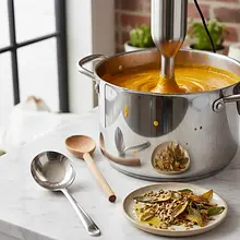 When the vegetables in the soup are soft, remove the pot from the heat. Using an immersion blender, blend the soup directly in the pot until it is perfectly smooth and velvety. Blend for a few minutes, moving the blender up and down to aerate the soup and ensure there are no lumps.