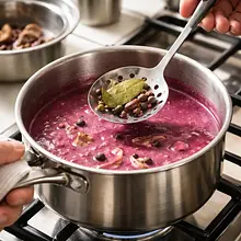 While the beets are roasting, prepare the remaining ingredients. Peel the onion and chop it into small cubes. Peel the garlic and finely chop it or press it through a garlic press. Crush the juniper berries with the flat side of a knife or in a mortar to release their aroma.