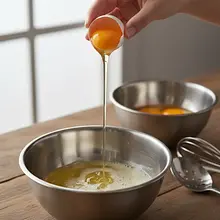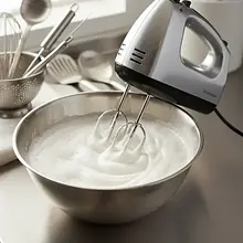 In the bowl with the reserved egg whites, add two pinches of salt. Start beating them with a mixer, gradually increasing the speed from low to high. Beat until the foam becomes white, thick, and stiff. Well-beaten foam should not fall out of the bowl when turned upside down. When you remove the mixer beaters, stiff, sharp 'peaks' should remain on them.