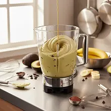 Start blending on low speed, then gradually increase to maximum speed. Blend for about 1-2 minutes until all ingredients are perfectly combined and the mixture becomes smooth, uniform, and shiny. During blending, take one or two breaks to scrape down the mixture from the sides of the container with a silicone spatula. This will ensure that all ingredients are evenly mixed.