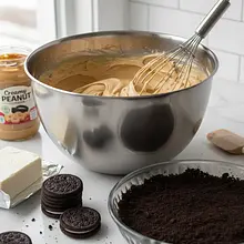 Here is a dessert that is the dream come true for every peanut butter and chocolate lover. Velvet No-Bake Peanut Butter Cheesecake on an Oreo Crust is a sophisticated blend of flavors and textures that doesn't require an oven. Its foundation is a crunchy, intensely cocoa-flavored crust made from Oreo cookies, which perfectly contrasts with the incredibly creamy and smooth cheese filling with a deep, nutty flavor. The whole is topped with a glossy dark chocolate glaze that cuts through the sweetness and adds elegance to the dessert. This cheesecake is not only incredibly delicious but also easy to prepare, making it the perfect choice for special occasions, gatherings with friends, or simply as a remedy for a bad day. Served cold, it melts in your mouth, leaving a lasting impression of luxury.
