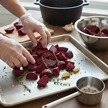 Preheat the oven to 200°C (fan). Thoroughly scrub the beets under running water, but do not peel them or cut off the ends - this will prevent the loss of juice and color. Dry them with a paper towel.