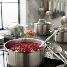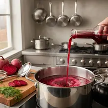 Remove the pot from the heat. Prepare another large, clean pot. Place a fine sieve or colander lined with double-layered cheesecloth over it. Slowly, in batches, pour the borscht through the sieve to separate the liquid from the vegetables and spices. Do not squeeze the vegetables too hard to keep the borscht clear.