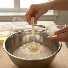 In a large bowl, sift 400 g of wheat flour, add 30 g of milk powder, 5 g of baking powder, and 2 pinches of salt. Mix the dry ingredients. Make a well in the center, pour in the active yeast and 20 ml of vegetable oil. Start mixing the ingredients from the center, gradually incorporating the flour from the edges until a cohesive dough forms.
