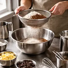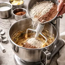Sift the flour and cocoa together into a large bowl (through a sieve with holes about 3–4 mm). Add the baking powder and salt, and mix the dry ingredients thoroughly with a wooden spoon or whisk to avoid cocoa lumps.