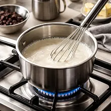 Prepare the ganache: in a small saucepan, heat 150 g of cream over low heat until it starts to gently steam and the first bubbles appear at the edges (do not bring to a boil) — this takes about 2–3 minutes. Meanwhile, chop the chocolate into small pieces and place it in a bowl.
