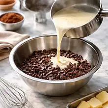 Pour hot cream over the chopped chocolate and let it sit for 2 minutes to allow the chocolate to melt. Then, vigorously mix with a whisk or spatula until smooth and glossy. Finally, add 30 g of butter and stir until combined — the glaze will become shinier and more velvety.