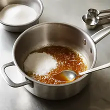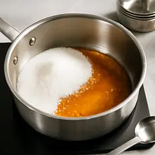 To prepare the caramel sauce, weigh out 100 g of sugar. In a wide pot with a thick bottom, melt the sugar over medium heat until it becomes liquid and golden brown (about 6-8 minutes). Meanwhile, heat 200 ml of cream in a small saucepan without bringing it to a boil. When the sugar reaches a nice amber color, remove the pot from the heat and slowly pour in the warmed cream in a thin stream, stirring constantly — be careful: it may splatter and release steam. After combining, add two tablespoons of cold butter (50 g) and 1 g of salt, and mix until smooth. Set aside to cool (about 15 minutes) — the sauce will thicken.