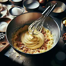 Use a wooden spoon or spatula. The mixture should be moist and combined, not dry or runny. Additionally, you can add almond flakes to the mixture for texture (optional).