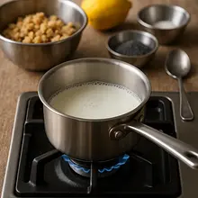 Use a small saucepan and a large metal or ceramic bowl. If the poppy seeds are whole (not ground), grind them in a coffee grinder for 20–30 seconds before the process. Do not pour boiling water over the poppy seeds — too hot milk can alter the flavor.