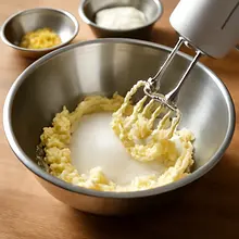In a large bowl (metal or glass), place the softened butter (200 g) and sugar (200 g). Beat with a flat mixer attachment or whisk on medium speed for 4–5 minutes, until the mixture is light, fluffy, and forms a so-called 'ribbon' — when you lift the mixer attachment, the mixture should slowly fall, creating a strand. Scrape the mixture down from the sides of the bowl with a spatula.
