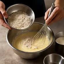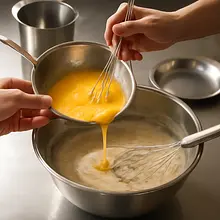 Sift the all-purpose flour (300 g) together with the baking powder (12 g) and salt (2 g) into a separate bowl. Add the almond flour (80 g) and gently mix the dry ingredients to evenly distribute the baking powder.