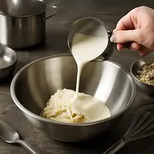 Add the dry ingredients to the mixture in three parts, alternating with the milk (120 ml): first 1/3 of the dry ingredients, mix with a spatula just until combined (about 15–20 seconds), then 1/2 of the milk, again 1/3 of the dry ingredients, the rest of the milk, and finally the remaining dry ingredients. Mix gently and briefly — the goal is to achieve a uniform mixture, not to develop the gluten.