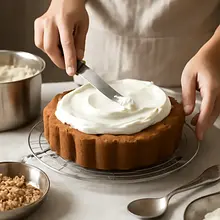 After baking, remove the pan from the oven and set it on a rack for 15 minutes to let the cake 'rest' and not loosen immediately after being taken out. After 15 minutes, tilt the pan and gently detach the sides, tap lightly, and remove the cake. Set aside to cool completely on the rack — at least 1 hour.