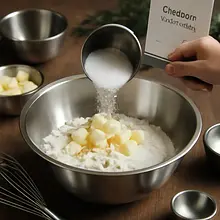 In a large bowl, mix the flour with the baking powder. Add the chopped butter and sugar, then knead until crumbly.