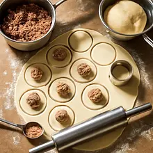 Roll out the dough to a thickness of about 3 mm. Cut out circles, placing a teaspoon of poppy seed filling in the center of each. Pinch the edges to form balls.