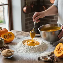 On a work surface or clean countertop, pour 150g of flour, add the cooled pumpkin and potato purée, 2g of salt, and optionally a pinch of nutmeg. Make a well in the center and crack an egg into it. Start gently incorporating the ingredients into the center using a fork or a dough scraper, then quickly knead with your hands to form a smooth, elastic dough. Work briefly, just until the ingredients are combined. If the dough is very sticky, gradually add the remaining flour (up to 50g). The finished dough should be soft but not sticky to the hands.