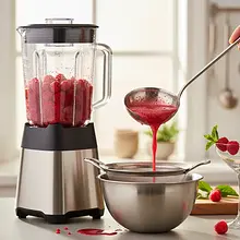 Przygotuj gładkie purée malinowe, które będzie podstawą koktajlu. Do kielicha blendera stojącego wsyp 300g mrożonych malin. Dodaj 60 ml świeżo wyciśniętego soku z limonki oraz 80 ml syropu cukrowego. Zamknij blender i miksuj na wysokich obrotach przez około 60-90 sekund, aż wszystkie składniki połączą się w jednolitą, gładką masę o intensywnym kolorze. Purée powinno być całkowicie pozbawione grudek lodu czy kawałków owoców.