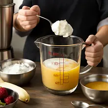 Taste the smoothie. If it's too thick, add 30 ml of orange juice and blend briefly (10–15 seconds). If it's too thin, add a few ice cubes or 30 g of frozen banana and blend again. If you need extra sweetness, add honey (up to 30 g) and mix well.