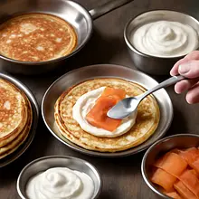 Bliny are traditional Russian thin pancakes (small, round), prepared both savory and sweet. In this version, we serve them as an elegant appetizer with smoked salmon, sour cream, and fresh dill — perfect for parties, Christmas dinners, or as a starter before the main course. Bliny have a slightly fluffy texture and a subtle taste of flour with a lightly buttery aroma; combined with smoked salmon, they create a creamy-salty contrast and a pleasantly fresh note thanks to the lemon and dill. Serve immediately after frying, arranged on a warm platter, decorated with capers and dill leaves — they look very impressive.