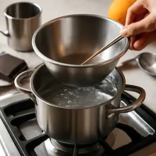 Prepare a water bath (bain-marie): pour about 3 cm of water into a medium pot and bring it to a gentle boil, then reduce the heat. Place a metal or glass bowl over the pot, ensuring it does not touch the water. Add the chopped chocolate and butter pieces to the bowl. Stir slowly with a wooden spoon or silicone spatula until the chocolate and butter are completely melted and the mixture is smooth and shiny (this usually takes 5–8 minutes over low heat).