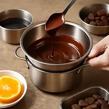 When the chocolate is smooth, remove the bowl from the pot and set aside for 1 minute. In a small cup, dissolve the instant coffee in 15 ml (about 15 g) of hot water — this will create an intense extract. Add the dissolved espresso, condensed milk, sifted cocoa, orange zest, and salt to the warm (not hot) chocolate. Stir vigorously for 30–60 seconds until the ingredients combine into a smooth, thick mixture. The mixture should have a uniform, shiny color and a slightly thick consistency that slowly drips from the spoon.