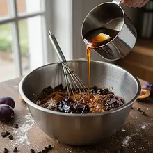 In a second, smaller bowl, combine all the wet ingredients. Crack the eggs and lightly beat them with a fork. Then add the milk, rapeseed oil, and plum preserves. Mix everything vigorously with a whisk until you achieve a uniform, smooth mixture with a liquid consistency.