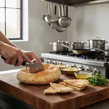 Każdy okrągły chlebek pita połóż na desce do krojenia. Za pomocą ostrego noża lub radełka do pizzy, przetnij każdy chlebek na cztery równe części, tak jak kroi się pizzę. Powinieneś otrzymać trójkątne kawałki. Z czterech chlebków pita uzyskasz w sumie szesnaście porcji.
