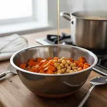 Start by preparing the vegetables. Preheat the oven to 200°C (fan or conventional). Wash the sweet potato thoroughly under running water, dry it, and peel off the skin. Cut it into even cubes about 1.5-2 cm on each side. Wash the red bell pepper, cut it in half, remove the seeds and white membranes, and then dice it into cubes similar in size to the sweet potato. Drain the canned chickpeas in a sieve and rinse them very well under cold running water until the water runs clear, then dry with a paper towel.
