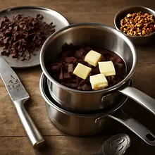 Chop the dark chocolate into small pieces, cut the butter into cubes. Melt the butter and chocolate together in a water bath: pour 2-3 cm of boiling water into a larger pot, place a heatproof bowl with the chocolate and butter over it so that the bottom of the bowl does not touch the water. Stir slowly with a silicone spatula until the mixture is smooth and shiny — this will take 5-8 minutes. Do not allow the chocolate to steam (steam and water vapor can cause the chocolate to "seize"). Alternative: briefly melt in the microwave in 20-30 second intervals, stirring after each, until you achieve a uniform mixture.