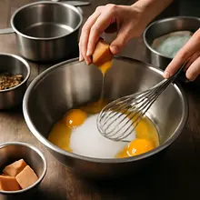 In a separate large bowl, crack the eggs (180 g, or 3 pieces) and add the sugar (300 g). Whisk with a hand whisk or mixer on medium speed for 2-3 minutes, until the mixture becomes slightly lighter and the sugar starts to dissolve — it is not necessary to achieve a fluffy foam, but the mixture should be smooth. Add vanilla extract (5 g), if using.