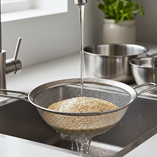 While the sweet potatoes are baking, cook the quinoa. Rinse 100g of quinoa in a fine sieve under cold running water very thoroughly. Rinse for about a minute, rubbing the grains with your hand. This step is crucial to remove saponins, which give quinoa a bitter taste. Transfer the rinsed quinoa to a small pot, add 200 ml of cold water (ratio 1:2), and add a pinch of salt. Bring to a boil, then reduce the heat to the minimum, cover the pot, and cook for 15 minutes until all the water is absorbed. Remove from heat and let it sit covered for another 5 minutes. Finally, 'fluff' the quinoa with a fork.