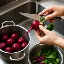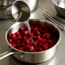 Check if you have cooked and peeled beets. If not: wash the beets, trim the leaves (leave 2 cm of the stems to prevent color loss), place them whole in a pot filled with cold water so that they are covered. Add 1 teaspoon of salt (about 5 g). Cook over medium heat with the lid slightly ajar for 45–60 minutes depending on size: small 30–40 min, medium 45 min, large 60 min. Check with a fork — it should easily pierce the beet. If you prefer roasting: wrap the beets in foil and bake at 200°C for 50–70 minutes.